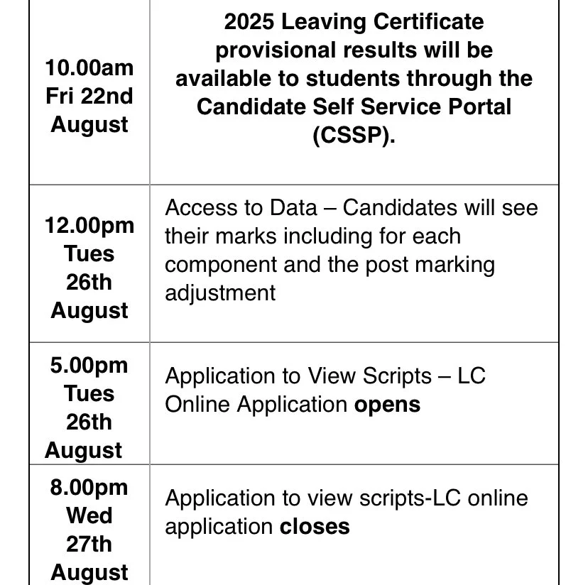 We wish the LC class of 2025 the very best of luck receiving their results on Friday 22nd August. Students will be able to access their results on the Candidate Self Service Portal (CSSP) from 10am. It is very important that all students should check their log-in details for the portal in advance of Friday.