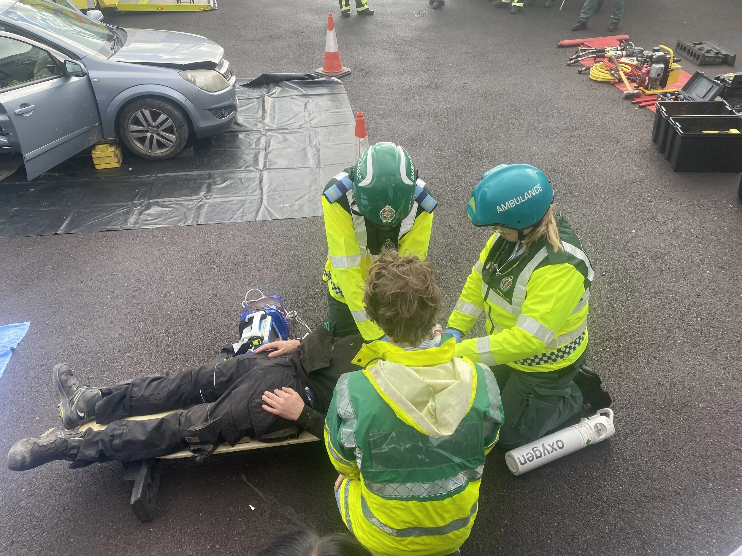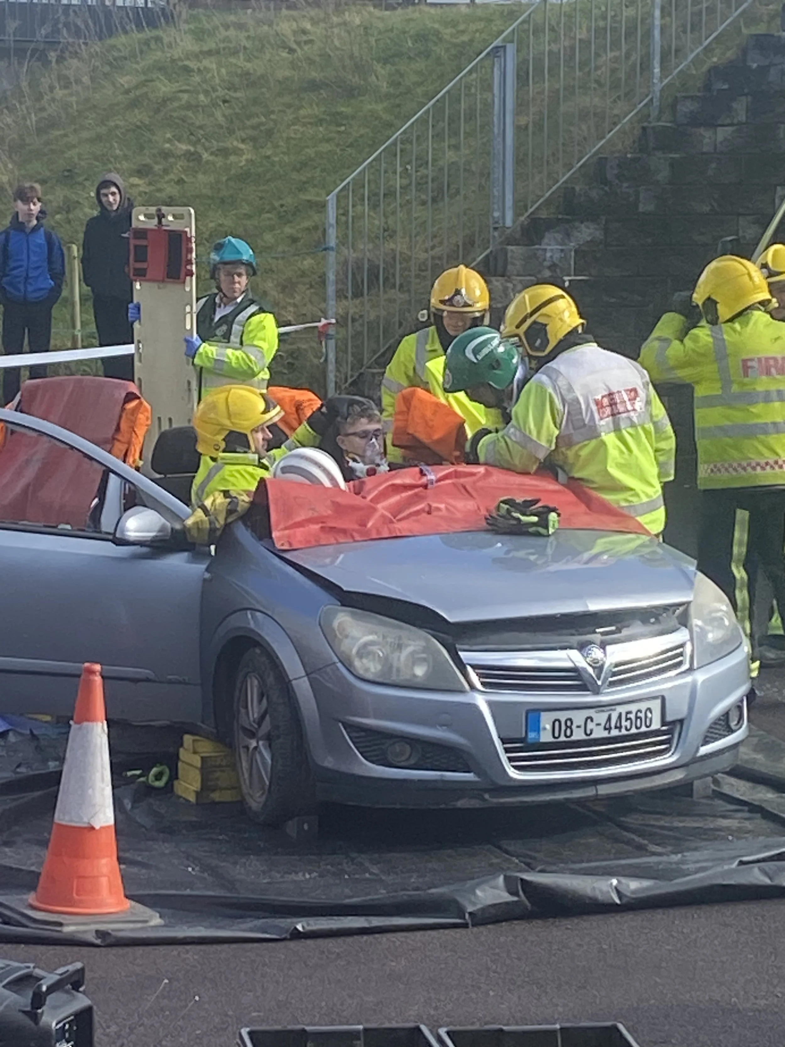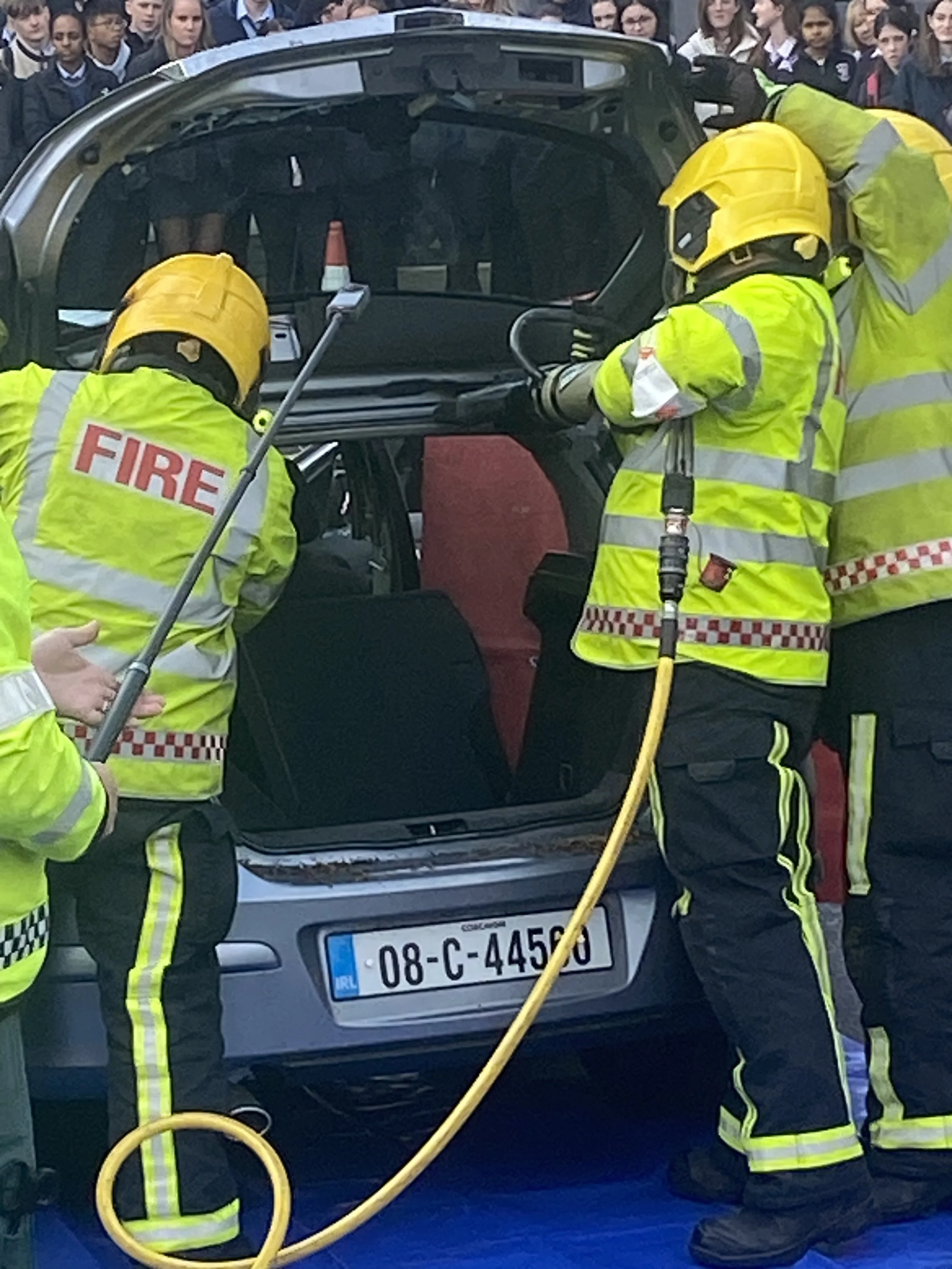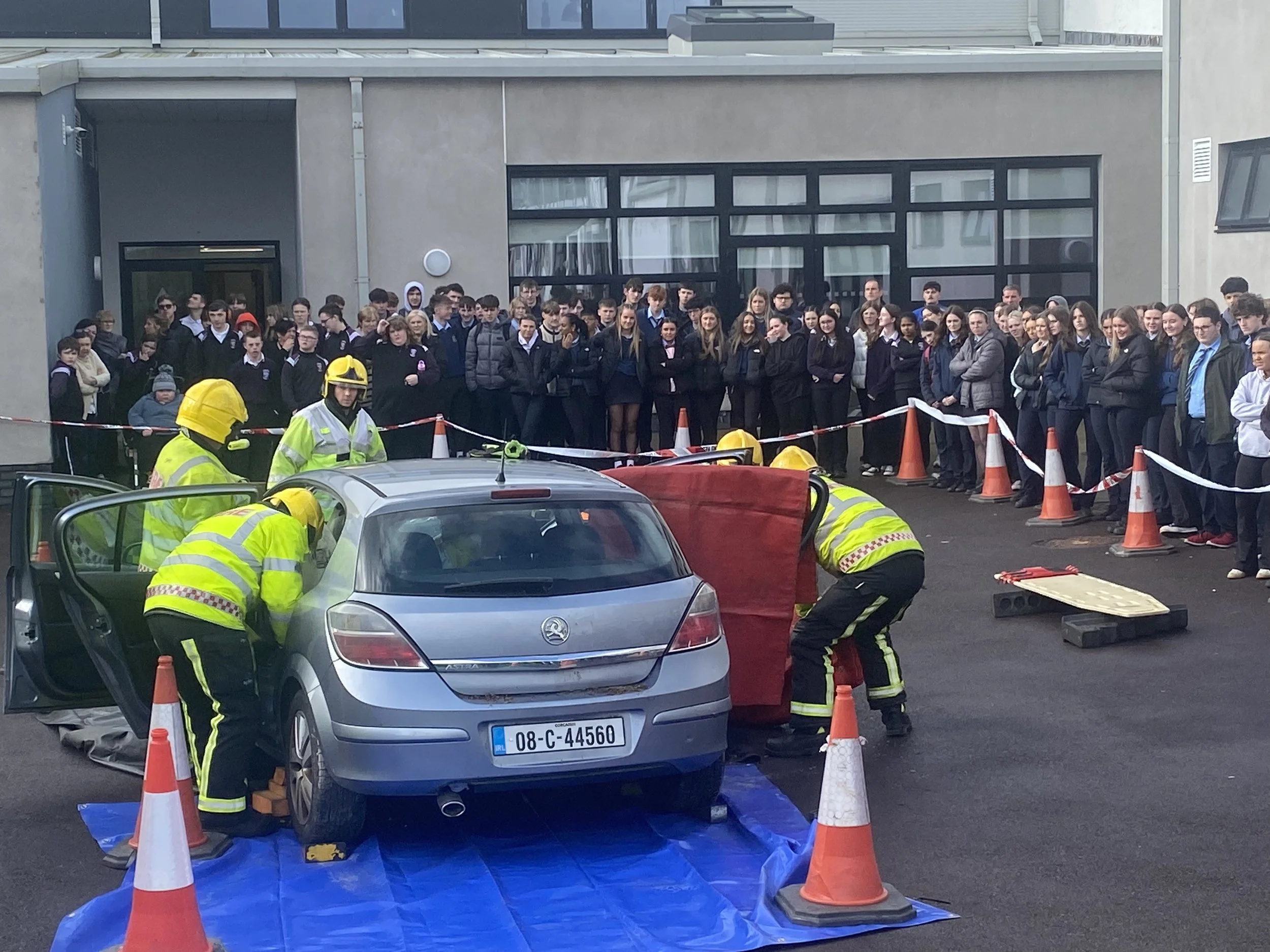 One of the standout elements of the day was a live crash‑scene demonstration. Three TY students volunteered to act as crash victims while the Fire Service team demonstrated how they respond to a serious collision. In an impressive display of skill and teamwork, firefighters cut the roof off a car to safely access the students, showing the precision and urgency required during real emergency extractions.