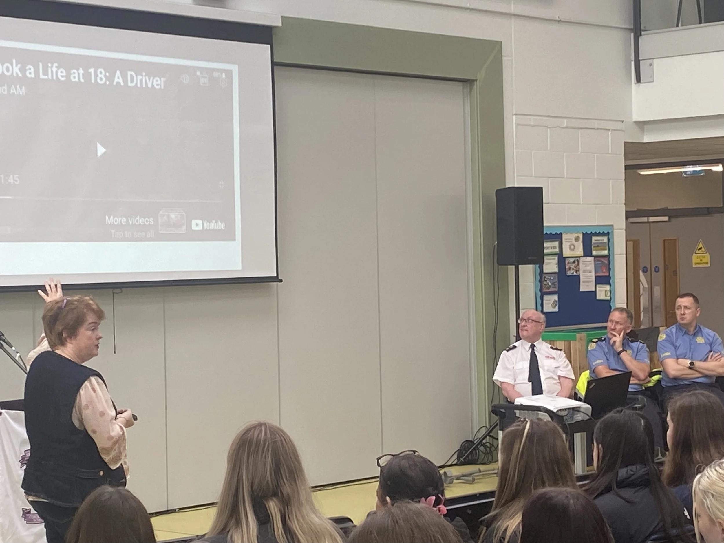 The programme began with an informative and engaging presentation by Caroline Casey of Cork County Council, who spoke about the far‑reaching impact of road accidents on individuals, families, and the wider community. Her message encouraged students to reflect on their responsibilities as future road users.